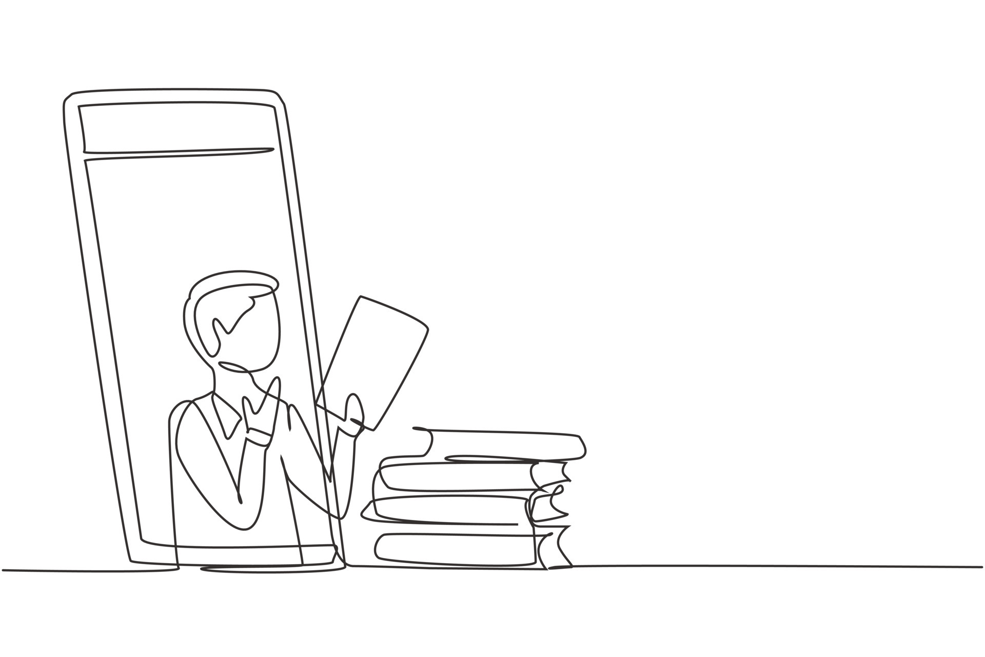 Continuous One Line Drawing Male Teacher Is Teaching Half Of His Body Is Out Of Smartphone Screen And Beside Him Is Pile Of Books Internet Class Single Line Draw Design Vector Graphic